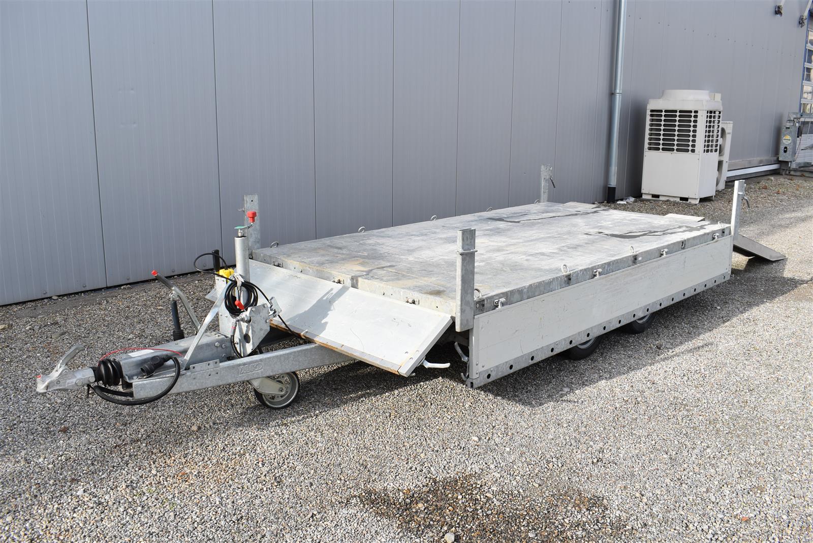 - (2 Alu-Auffahrrampen 2'560x280 mm, Tragkraft bei Achsabstand 1m=2'600kg und bei 1.5m =2'850kg, Einschubfach für Auffahrrampen, elektrische Pumpe mit Nothandpumpe und batterie, Ladeleitung mit Batterie, Abstellstützen am Heck,), Aluboden, Alu-Seitenläden (350 mm abklappbar), Binderinge (seitlich versenkbar), Heckladen pendelnd