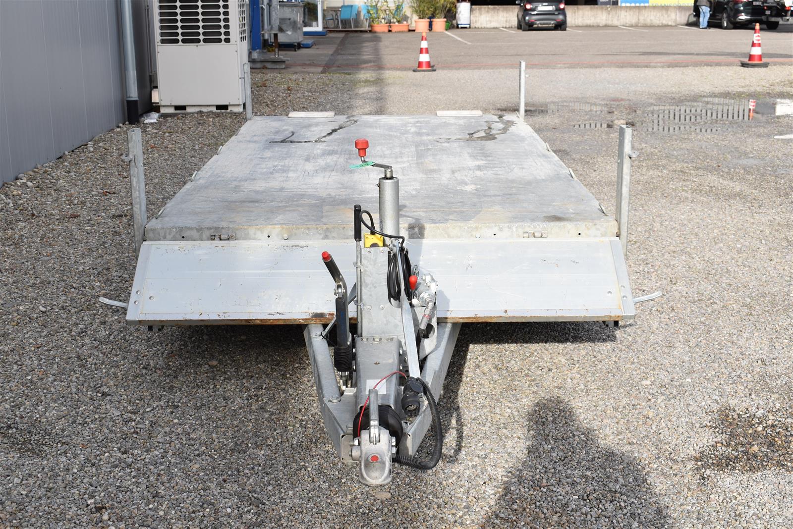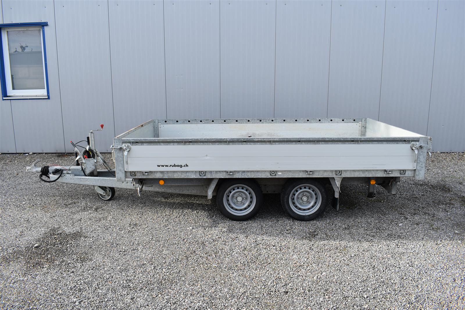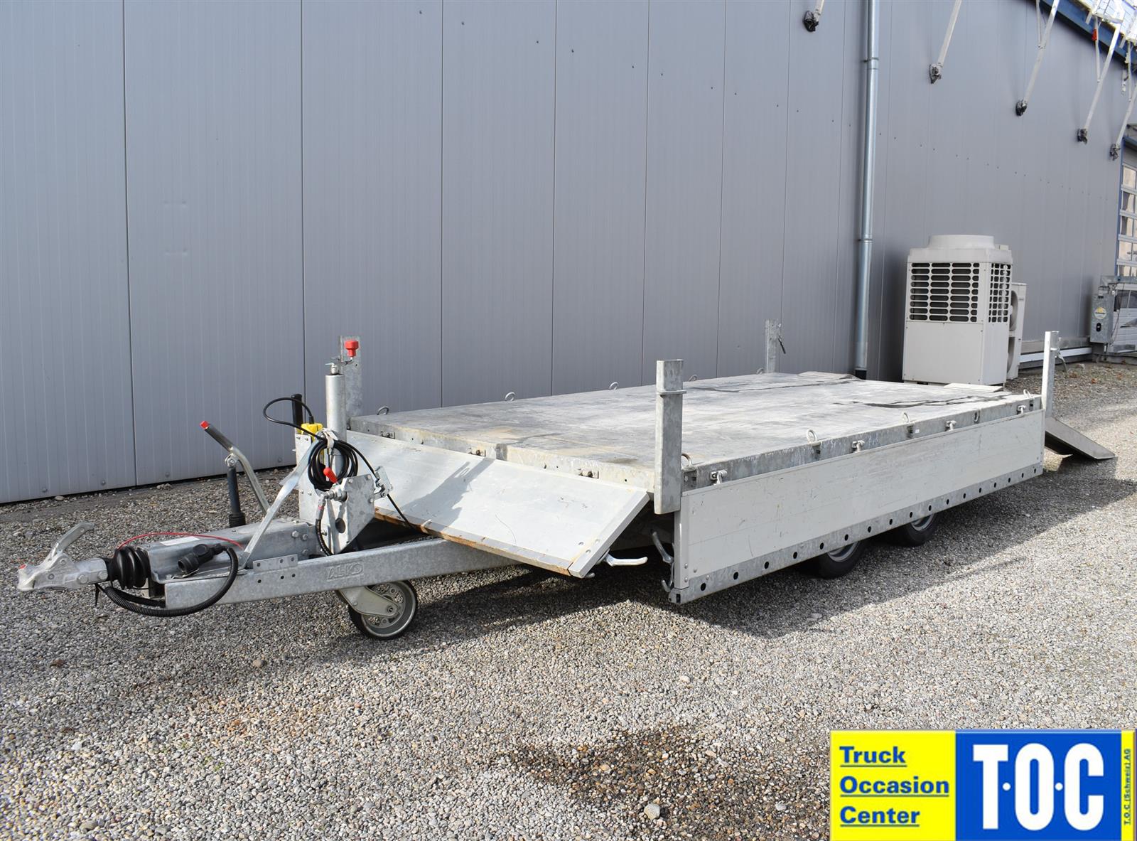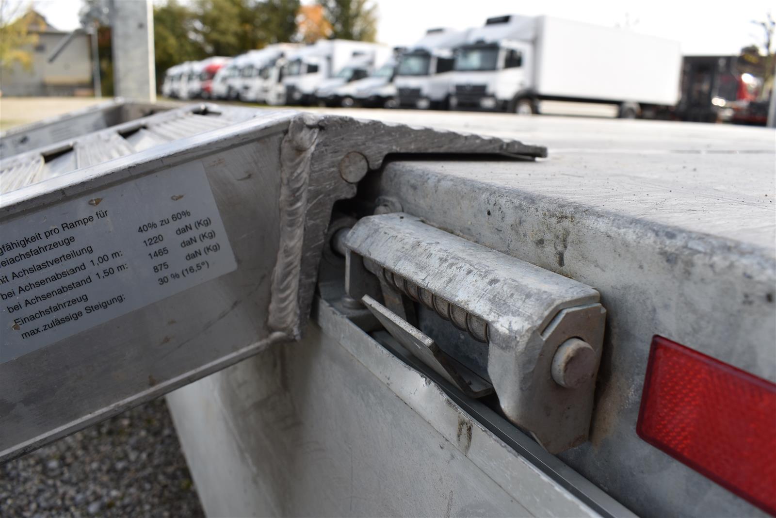 - (2 Alu-Auffahrrampen 2'560x280 mm, Tragkraft bei Achsabstand 1m=2'600kg und bei 1.5m =2'850kg, Einschubfach für Auffahrrampen, elektrische Pumpe mit Nothandpumpe und batterie, Ladeleitung mit Batterie, Abstellstützen am Heck,), Aluboden, Alu-Seitenläden (350 mm abklappbar), Binderinge (seitlich versenkbar), Heckladen pendelnd