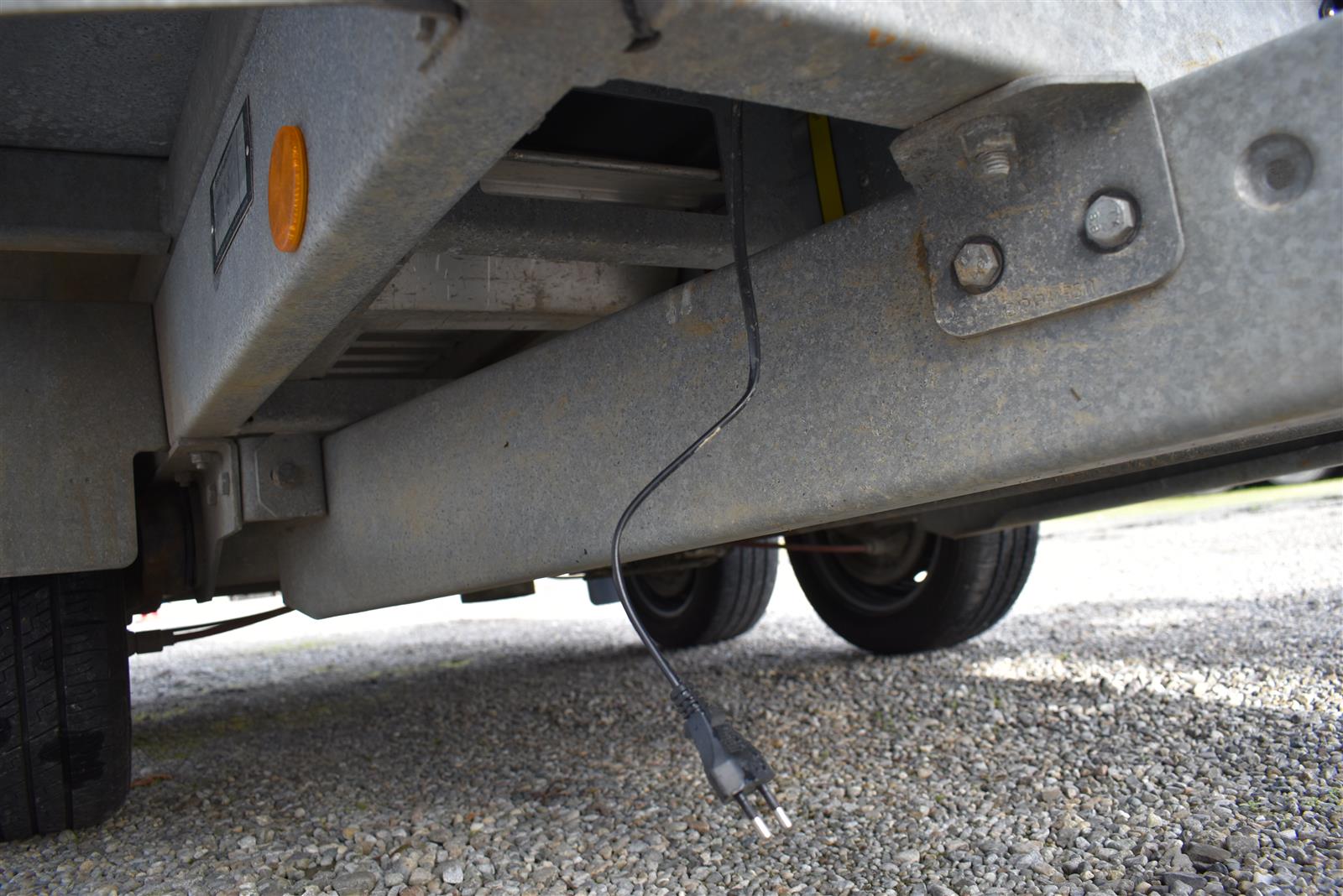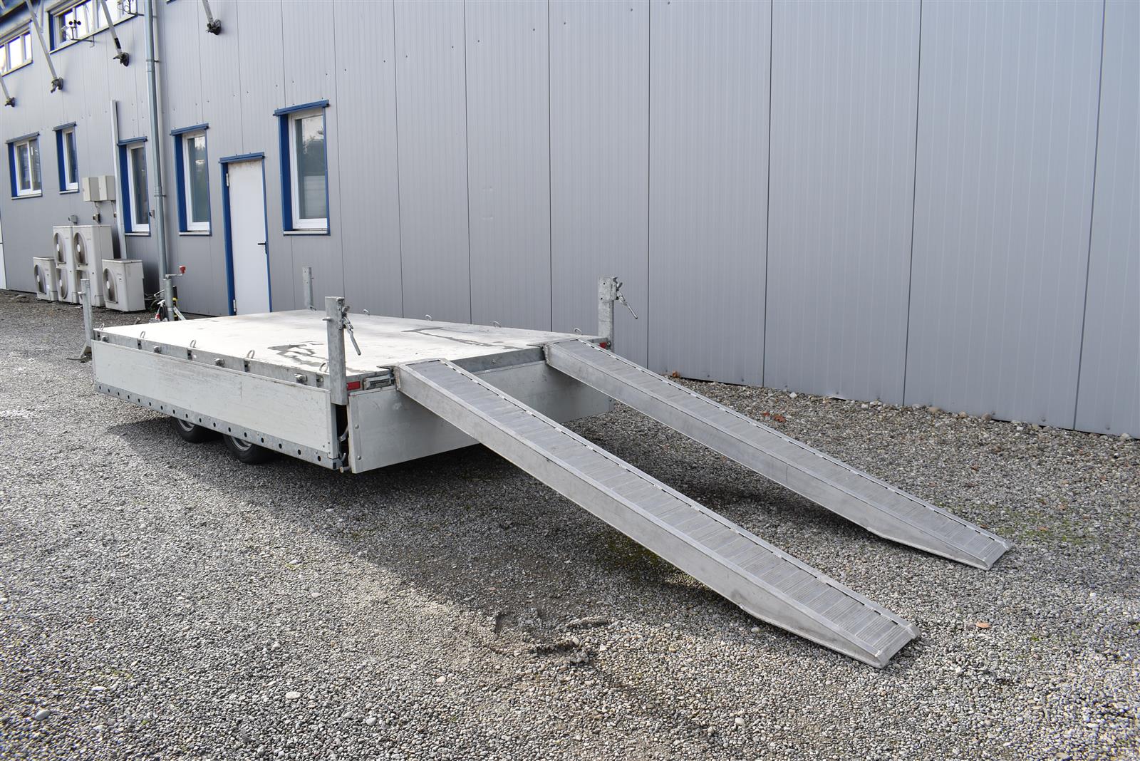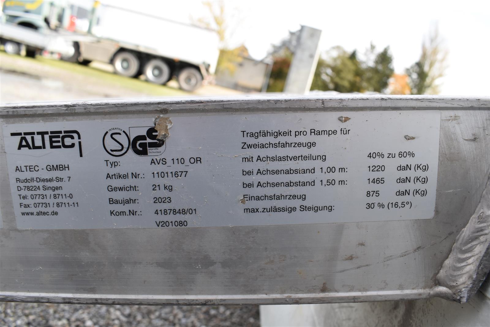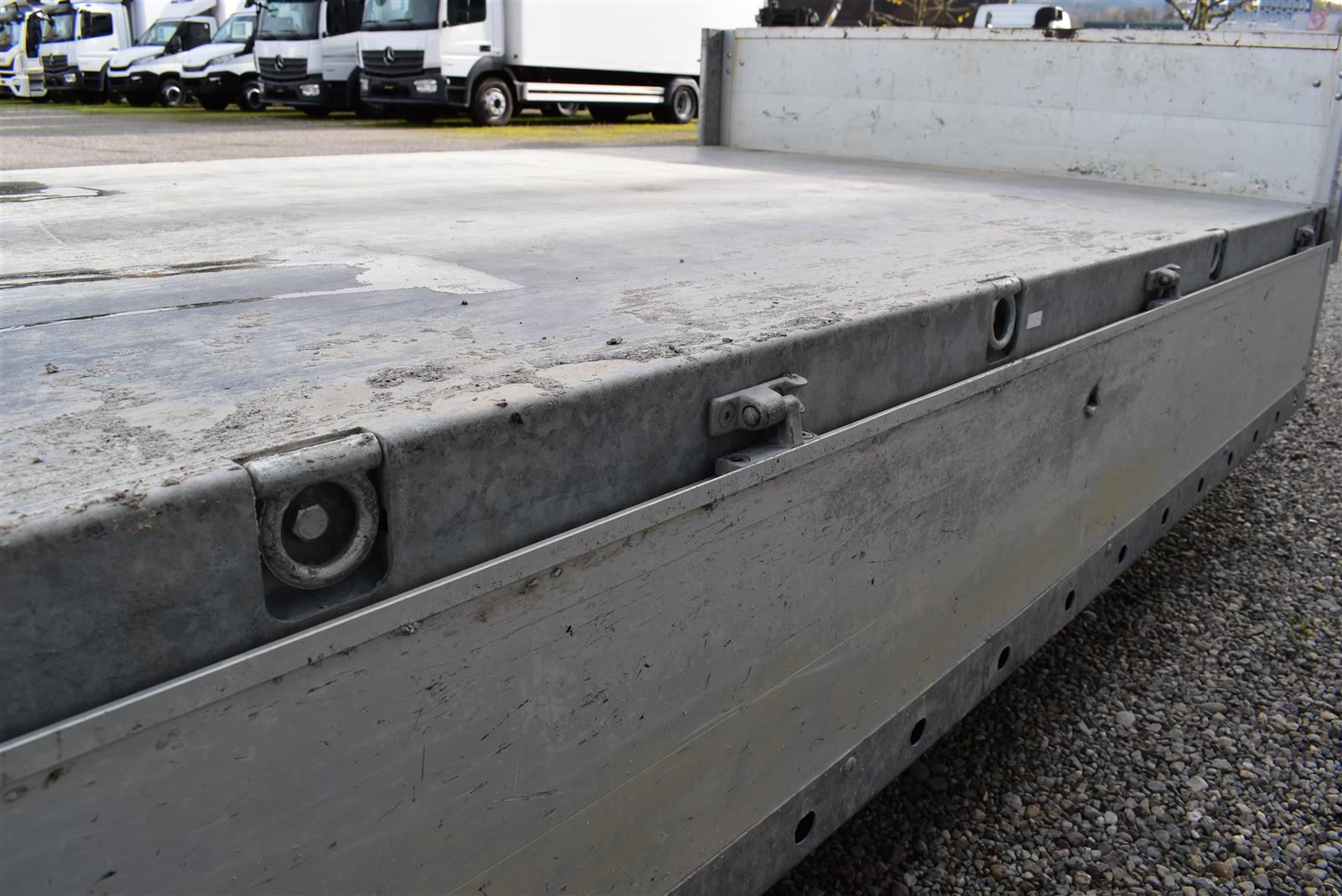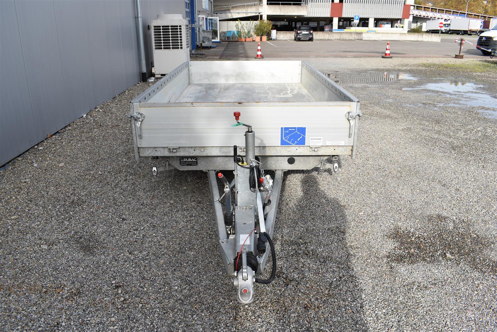- (2 Alu-Auffahrrampen 2'560x280 mm, Tragkraft bei Achsabstand 1m=2'600kg und bei 1.5m =2'850kg, Einschubfach für Auffahrrampen, elektrische Pumpe mit Nothandpumpe und batterie, Ladeleitung mit Batterie, Abstellstützen am Heck,), Aluboden, Alu-Seitenläden (350 mm abklappbar), Binderinge (seitlich versenkbar), Heckladen pendelnd
